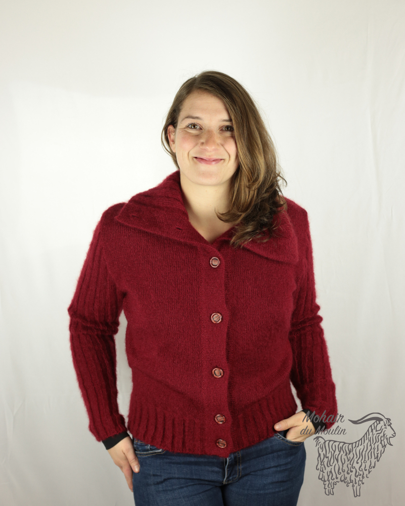Tricoté à la machine, avec le fil « Concerto« , il est en jersey sur le devant, et avec des côtes dans le dos et sur les manches : de cette façon, il est cintré sans être trop moulant. Un petit col pour couvrir le cou et la gorge, et voilà.