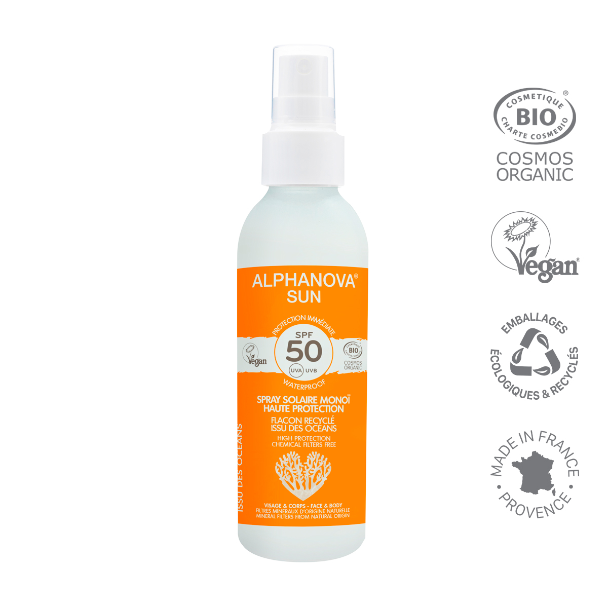 Ce spray solaire adultes en plastique recyclé & recyclable qui contribue au nettoyage des océans & des mers. Une protection solaire bio, vegan et écoresponsable à glisser dans son sac de plage, qui sera idéale pour protéger votre peau. Cette haute protection SPF50, parfum monoï, s’applique facilement et assure une protection immédiate et waterproof contre les UVA et UVB.
