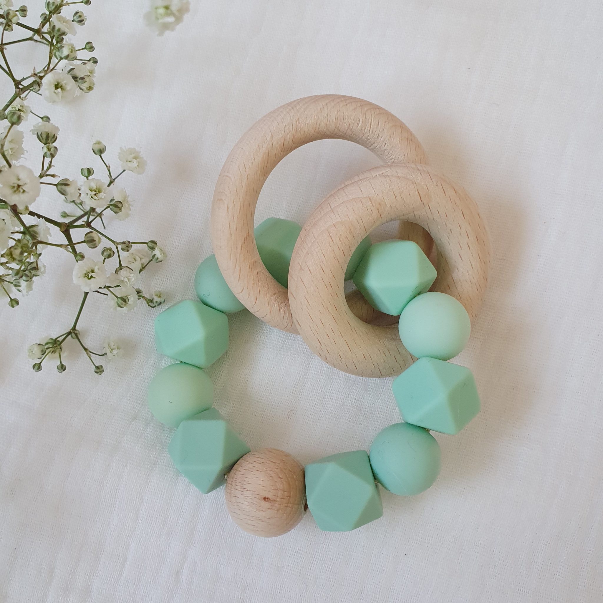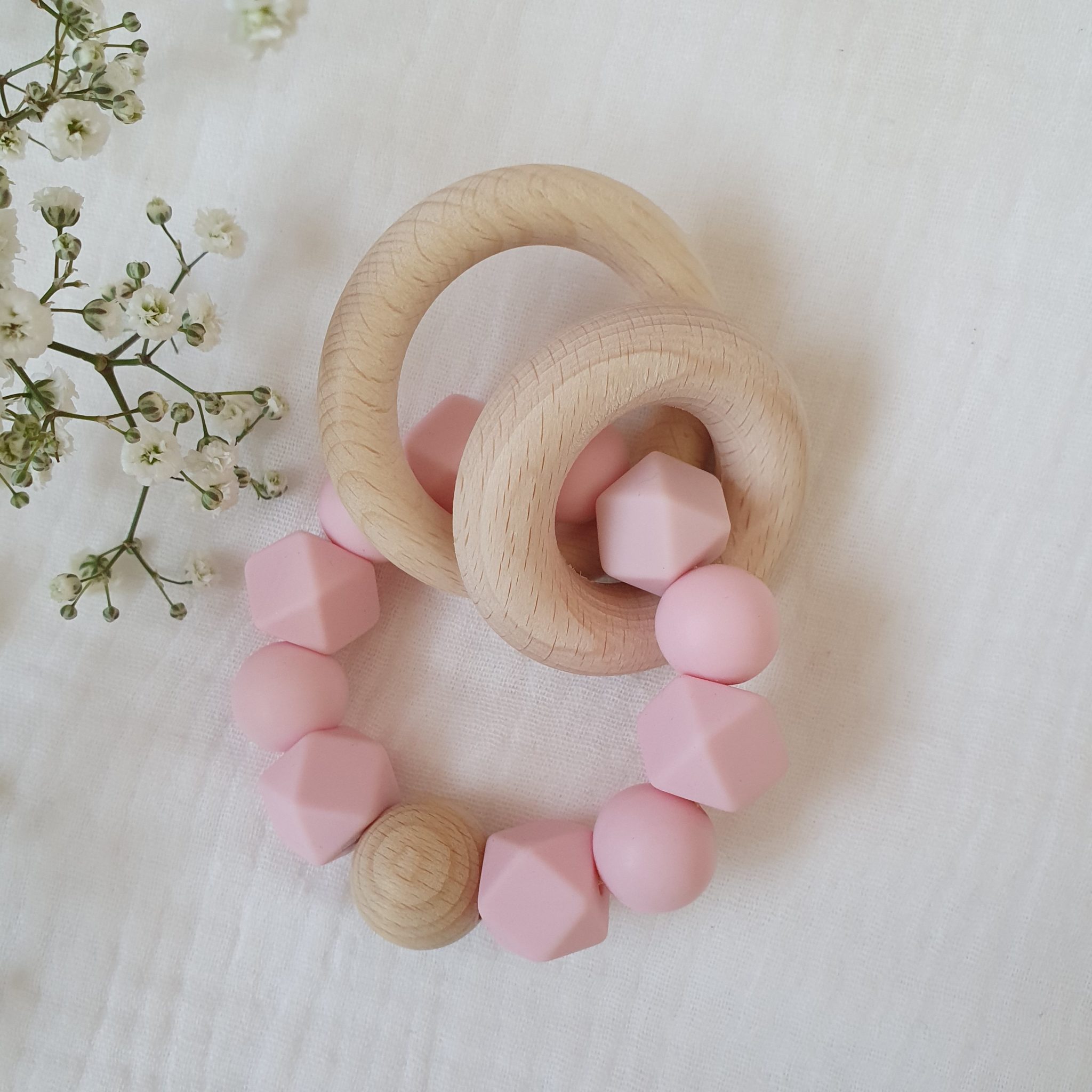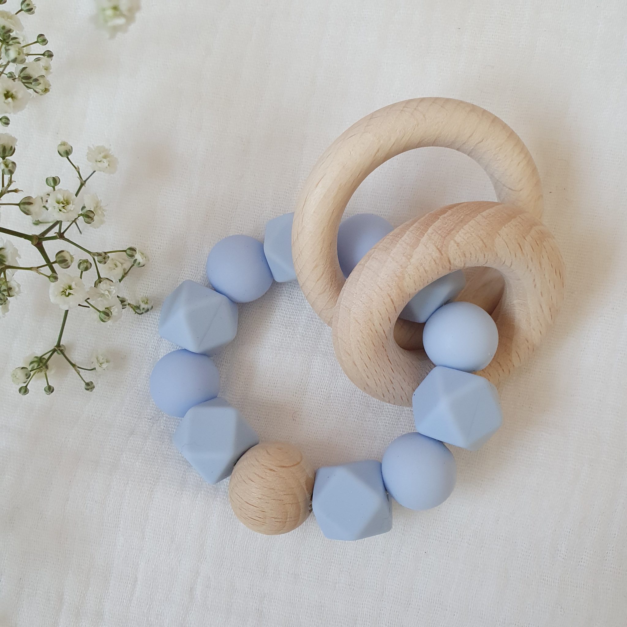 Composé de deux anneaux en bois qui font du bruit pour amuser bébé, et de perles en silicone alimentaire, très utiles pour soulager les gencives lors des poussées dentaires.
