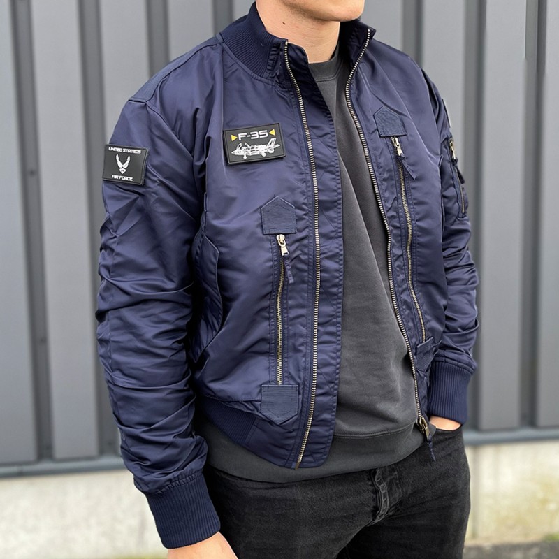 Ce blouson aviateur F35 est équipé de patch en PVC et de divers poches avec fermetures éclair.