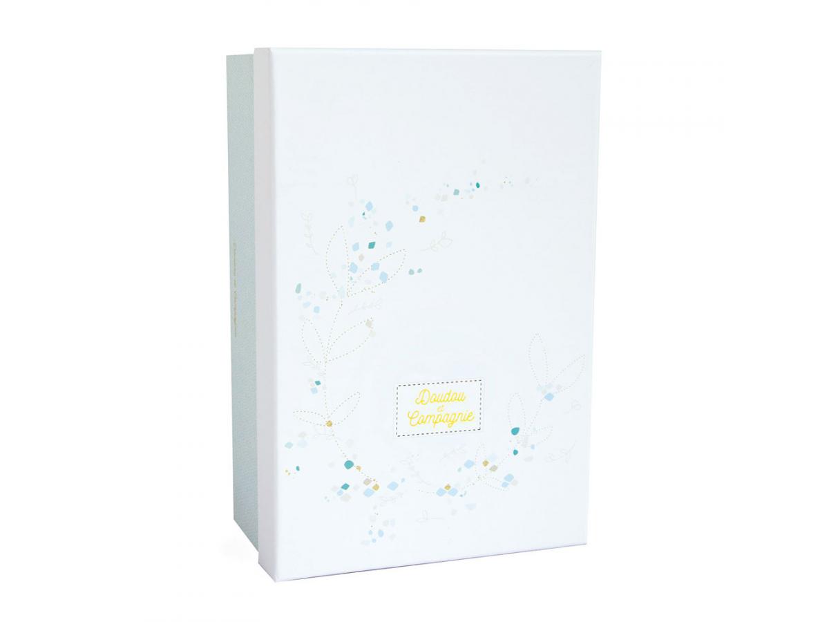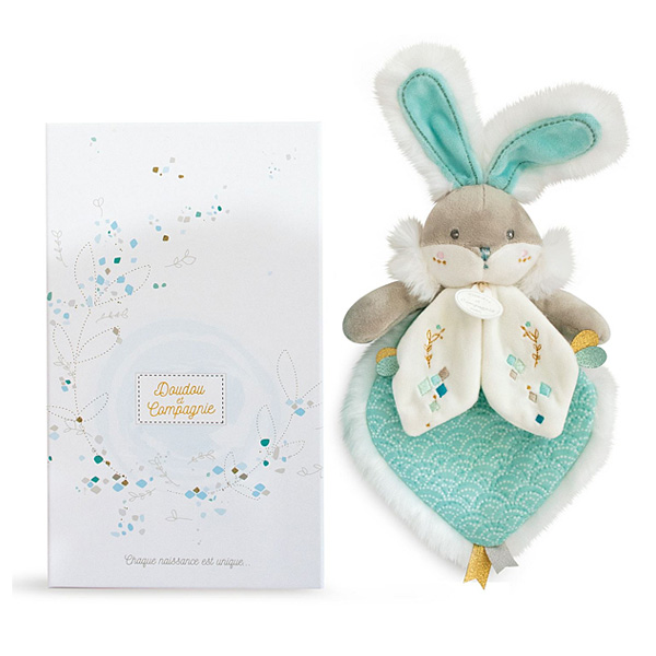 Un magnifique doudou lapin vert menthe, bien au chaud dans son joli coffret cadeau, prêt à câliner bébé et à devenir son meilleur ami!