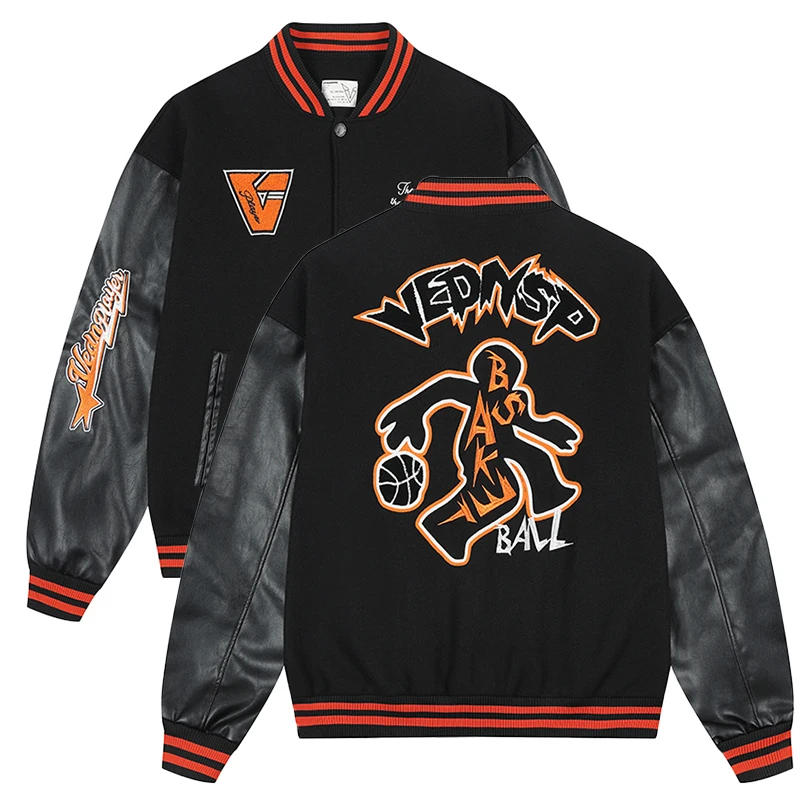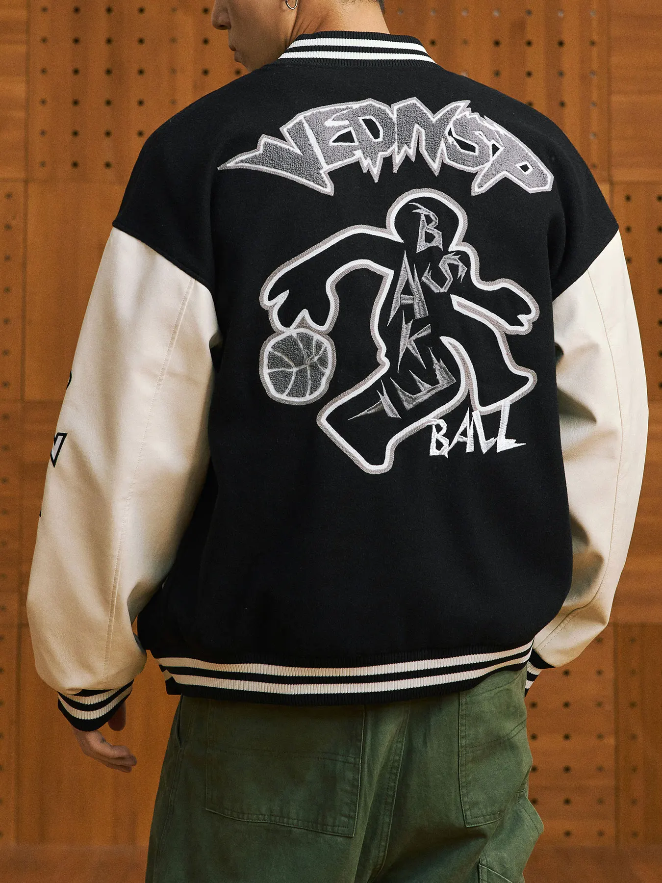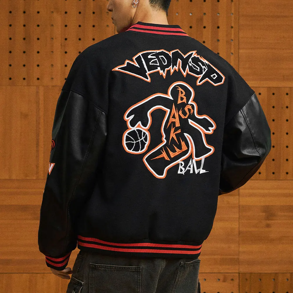 Cette veste se distingue par son motif brodé audacieux dans un style inspiré du basket-ball universitaire. Son jeu de couleurs contrasté entre le corps et les manches renforce son identité dynamique.