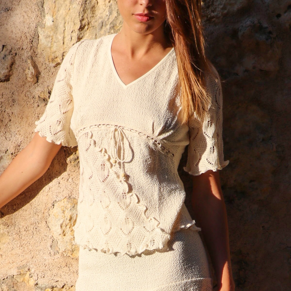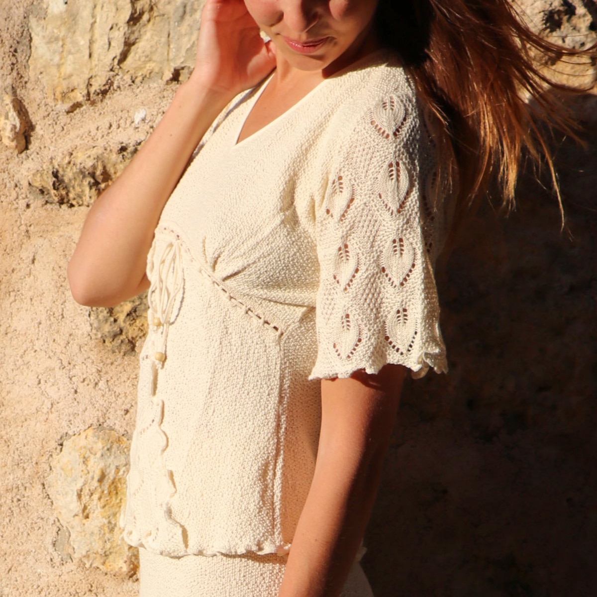 Top tricoté en coton bio de couleur écru, manche trois quart en broderie dentelles de très haute qualité,