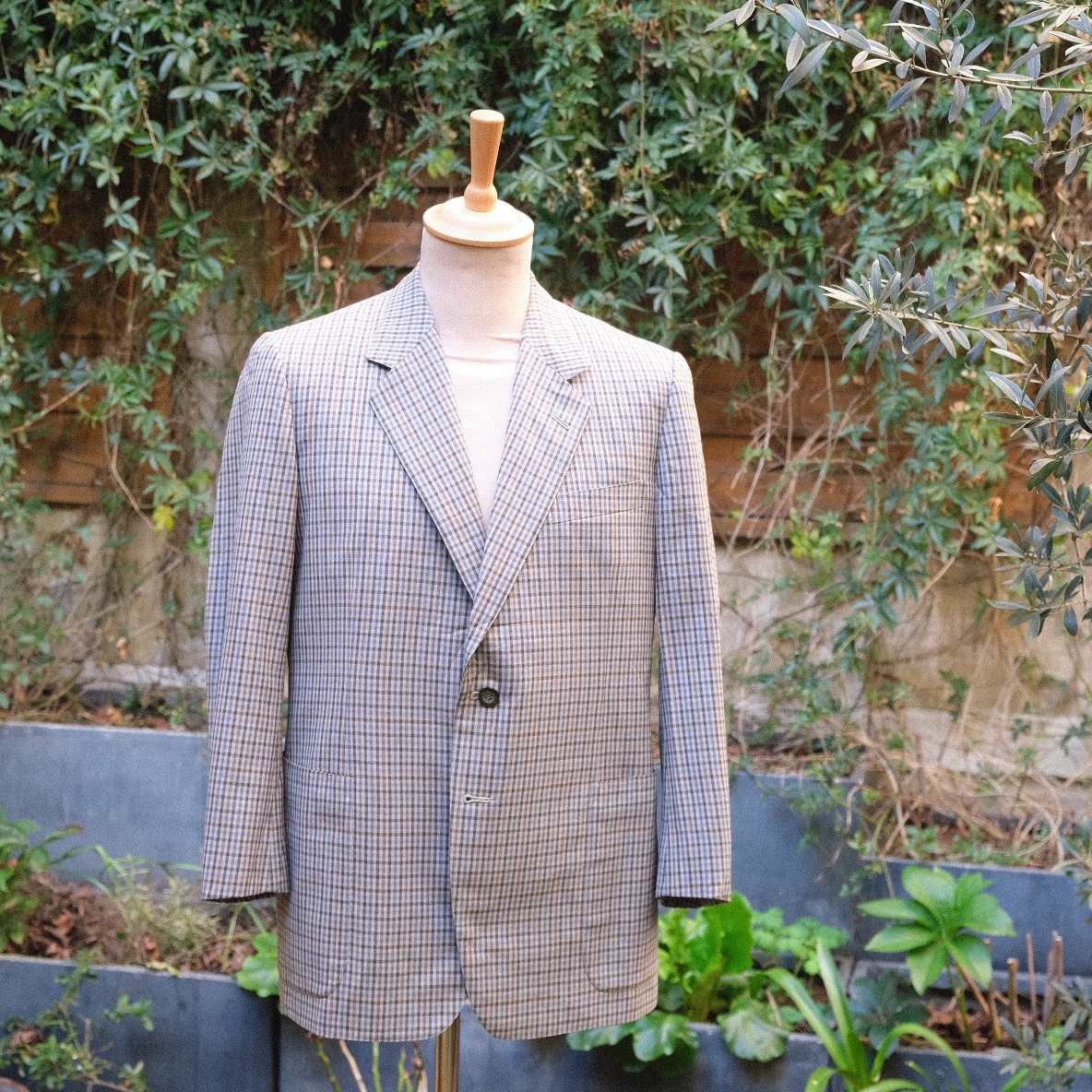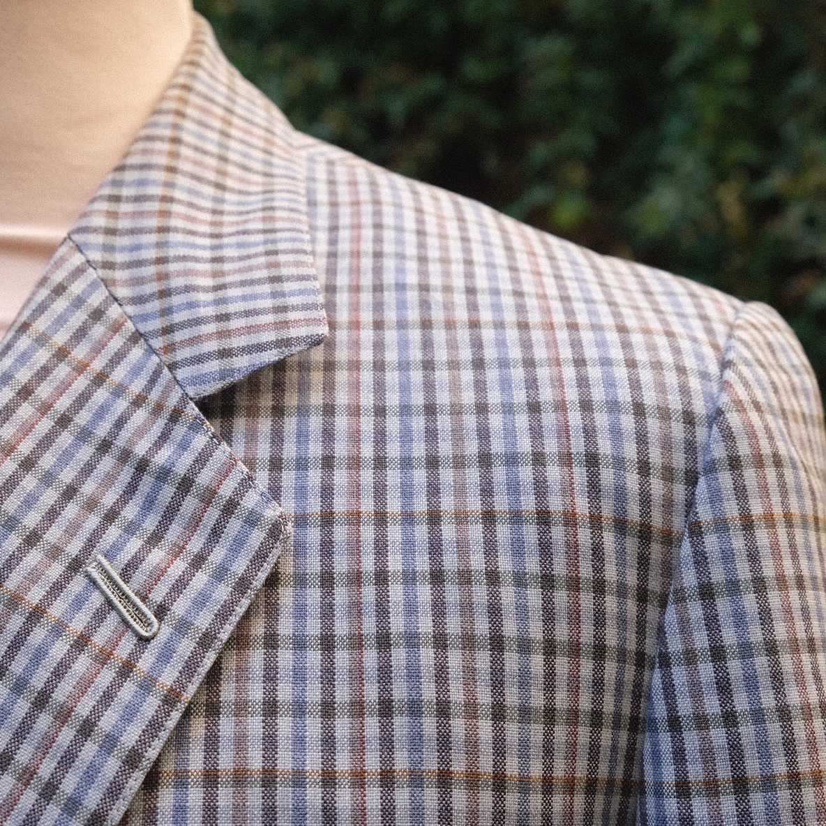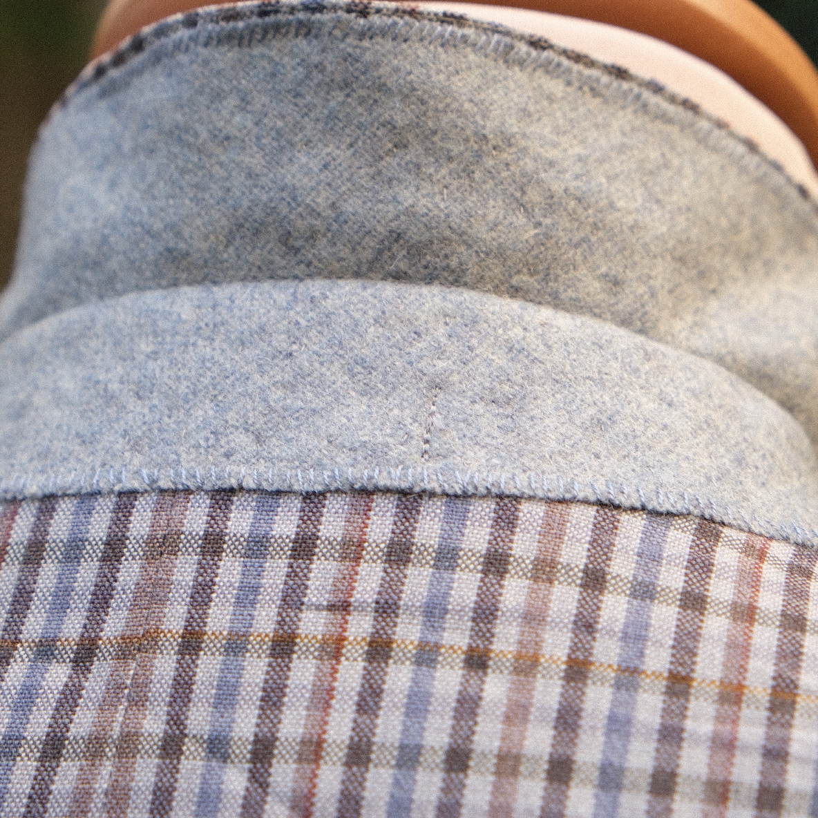 Une veste d’un tailleur confidentiel réalisée à partir d’une belle laine Scabal: elle est évidemment entièrement entoilée. On apprécie particulièrement la subtilité des couleurs du motif carreaux et l’absence de doublure dans le dos pour un modèle plus respirant en été.