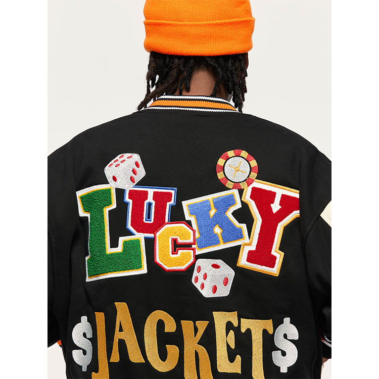 Cette veste universitaire noire présente un design classique qui convient parfaitement à tous les types de tenues décontractées. La veste est fabriquée en tissu de coton confortable avec un style varsity unique pour un look cool. Elle possède un col rond, des manches blanches, des poches sur le côté pour ranger tes affaires et une borderie à l’arrière pour une touche de style supplémentaire.